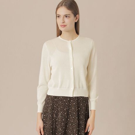 シンプルなニットショートカーディガンです。首に沿った小さな衿開きが繊細で、前立ての小さな釦もアクセントになっています。短い着丈と八分丈の袖が軽く涼しげな印象で、夏の羽織として活躍します。