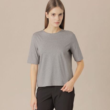 クルーネックでベーシックなカットソートップスです。袖は肘丈で、エレガントなスタイリングに合わせやすい様、色によってボーダーピッチを変えて展開しています。