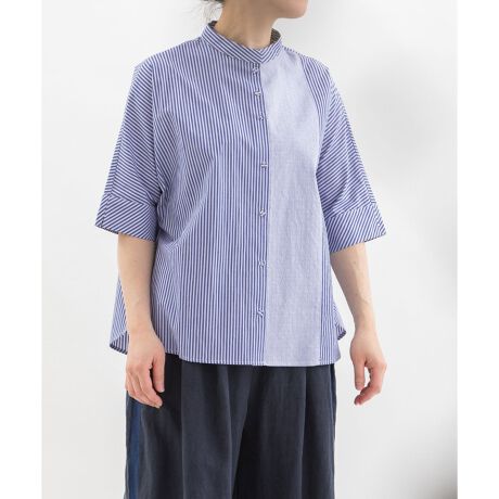 2種類の生地を組み合わせた5分袖シャツ。身頃続きのドルマンスリーブで、肩からのラインが華奢見えする人気のシルエットです。パンツにもスカートにもあわせやすく、スタイルが決まりやすいこなれシルエット。お袖は肘が隠れる5分袖で、カフスそのままでも折り返しても着られます。オフホワイトとブラックはエンブロイダリーレースとの組み合わせ、ストライプはシャンブレーとの組み合わせです。不規則なボタン間隔は、さりげないアクセントに。開けた時にちらりと見える配色ステッチもポイントです。■Cloche:クロッシュ