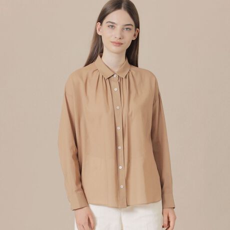 ドロップしたアームホールと、衿ぐりのギャザーから裾に向けて広がるシルエットがリラックスしたムードのブラウスです。シアーな素材感で、前を明けて羽織としても活躍します。