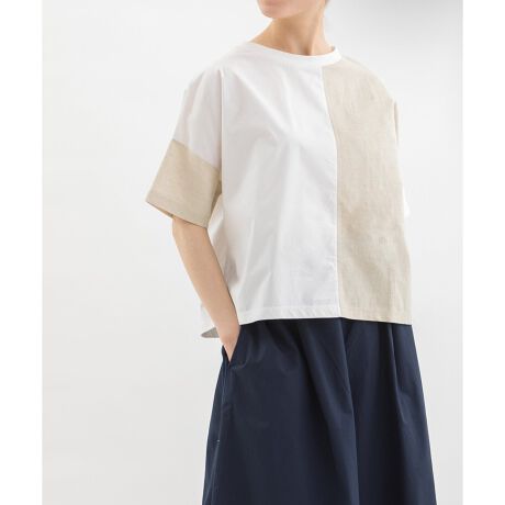 タイプライターとリネンコットンの2種類の生地を組み合わせたTシャツ。後ろ見頃はUSAコットンのカットソー生地になっています。ラフな着心地とブラウス見えするきちんとさを兼ね備えたトップスです。後ろネック下には繊細なステッチスワン刺繍あり。