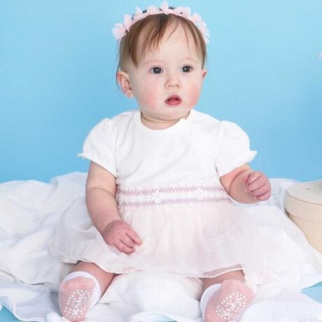 スモッキングの上にはお花のレースをあしらって細かいところまで可愛いにこだわったデザインにになっています。