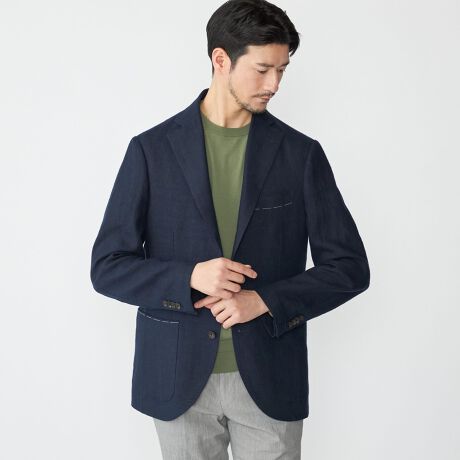 アンコン仕立てのリネンジャケットにはシャツのような軽やかさがあり、夏に最適な雰囲気となっております。