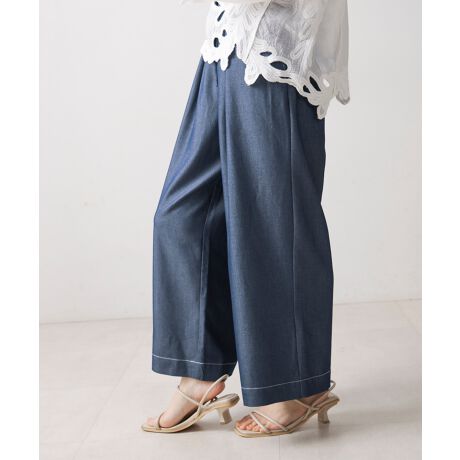 デニムライクでしわしわになりにくい素材を使用したシンプルで重宝するパンツ。大人が着てカジュアルすぎずにおしゃれにきまるパンツを目指しました。程よいセミワイドシルエットで広がりすぎないので、ジレなどのレイヤードにも合わせやすいように仕上げました。ウエストはオールゴムで、アクセントにもなる紐で、ウエストサイズ調整可能です。
