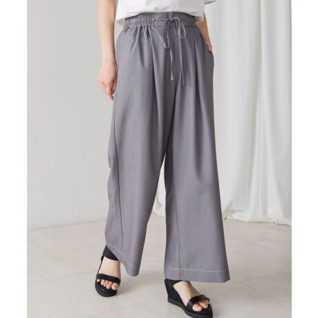 デニムライクでしわしわになりにくい素材を使用したシンプルで重宝するパンツ。大人が着てカジュアルすぎずにおしゃれにきまるパンツを目指しました。程よいセミワイドシルエットで広がりすぎないので、ジレなどのレイヤードにも合わせやすいように仕上げました。ウエストはオールゴムで、アクセントにもなる紐で、ウエストサイズ調整可能です。