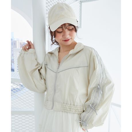 スポーティーなトラックブルゾンにリボンとレースが施されたガーリーなアイテム