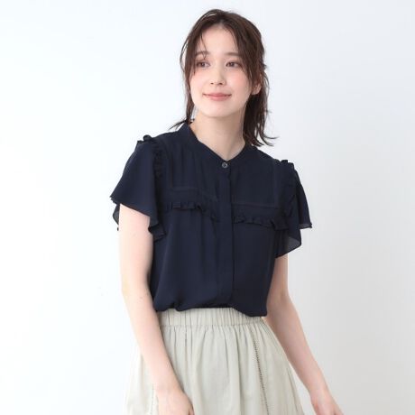 身頃上部にかわいらしいフリルを施したブラウス。フリルが立ちにくいやわらかい生地感で着やすく仕上げました。