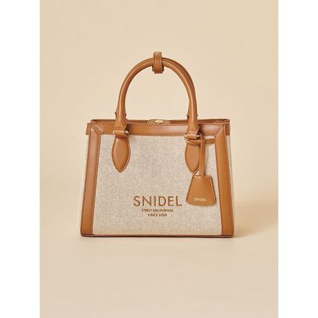 SNIDELの定番人気アイテム、キャンバスロゴバッグの付属のショルダーストラップが、キャッチーなSNIDELロゴ入りのウェビングストラップになりました。バッグは、オーガニックコットンを使用したキャンバス地に、ハンドルやパイピング部分にはレザー調素材を組み合わせた異素材ミックスが特徴。シンプルながら上品なデザインを実現。フロントのSNIDELロゴ刺繍が高級感を演出します。バッグの底には底鋲付きで安定感があり、汚れも防止。財布やミニタンブラー、折り畳み日傘が入る大容量設計で、内ポケットも付いておりカード類の収納にも便利です。開口部はマグネット仕様で中身が見えにくく、サイドボタンを開くとガバッと広がり、取り出しやすさも抜群。カラーはベーシックなブラック、フェミニンなライトベージュ、きちんと感のあるキャメルの3色展開です。
