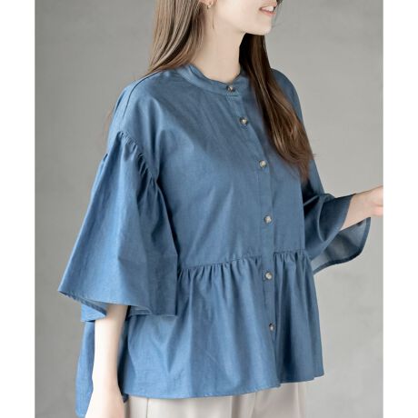 ギャザー切り替えでふわっと広がるボリュームデザインのデニムブラウス。
