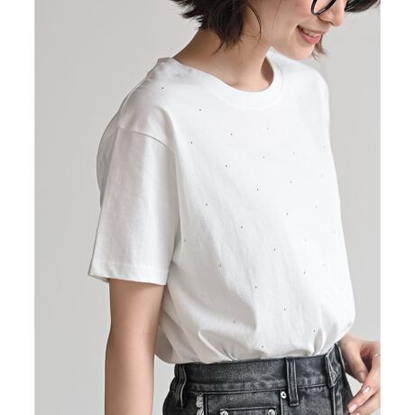 小さなメタルホットフィックスをあしらったデザインTシャツ。