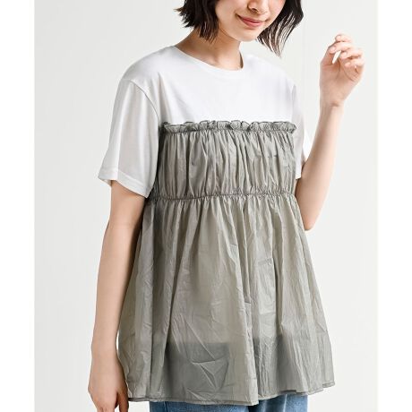 Tシャツにビスチェを重ねたようなレイヤード風のドッキングトップス。