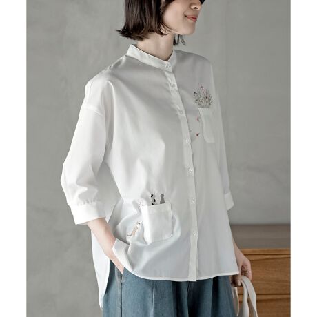キャットフラワーバンドカラー7分袖シャツ