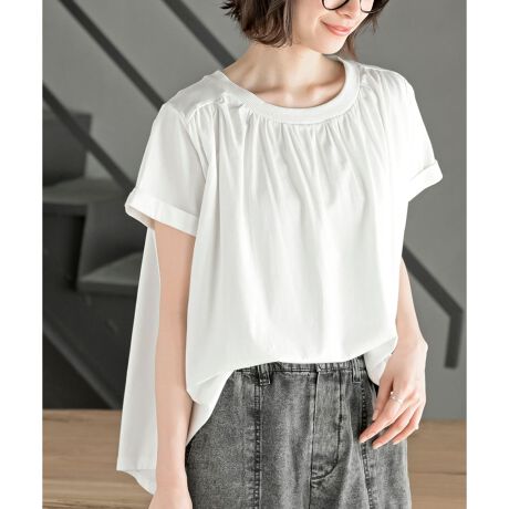 襟元、肩、背中にあしらったたっぷりのギャザーが作り出す女性らしいシルエットが魅力のトップス。