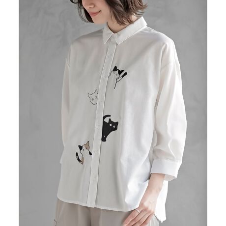フロントから左右に顔を出した猫ちゃんがとっても可愛い刺繍シャツ。
