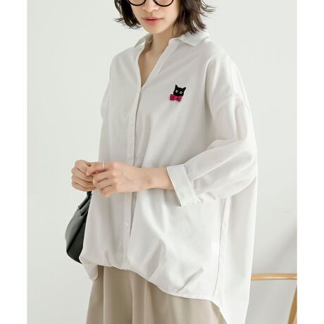 蝶ネクタイをした猫ちゃん刺繍がポイントのシャツブラウス。