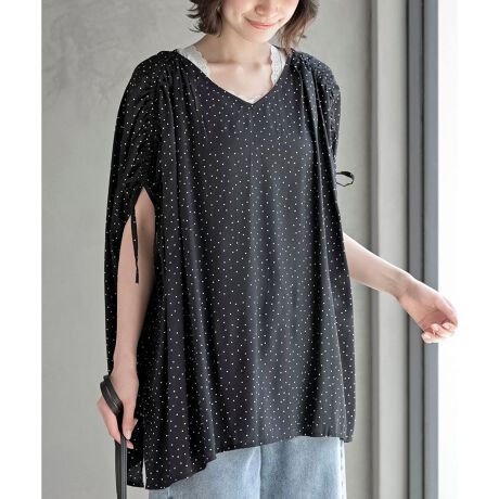 肩のドロスとギャザーが女性らしい雰囲気を演出。