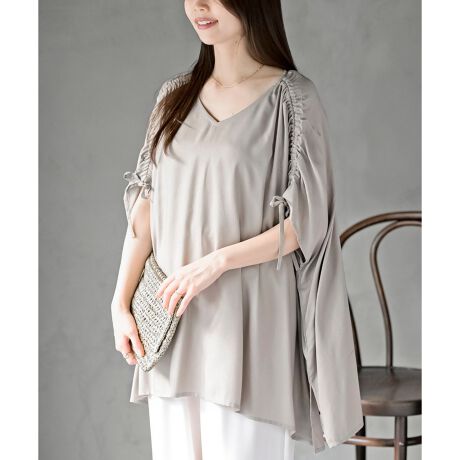 肩のドロスとギャザーが女性らしい雰囲気を演出。