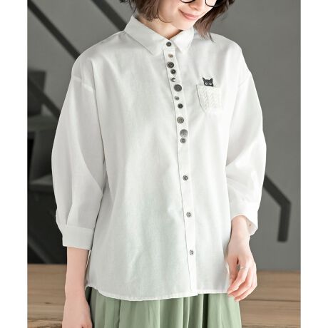 くりくりお目目の猫ちゃん刺繍が可愛いシャツブラウス。