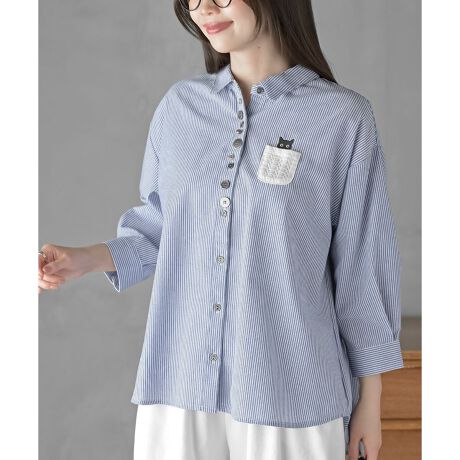 くりくりお目目の猫ちゃん刺繍が可愛いシャツブラウス。