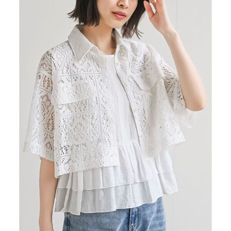 レトロ可愛い総レースのクロプドシャツ