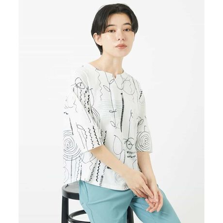 線で描かれた花柄とほのかな葉っぱ柄がやさしい印象のプリントカットソー。