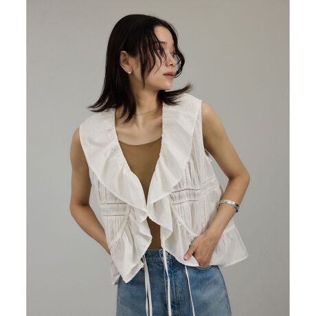 衿から裾へとつながる贅沢なフリルデザインが魅力のフリルノースリーブブラウスです。