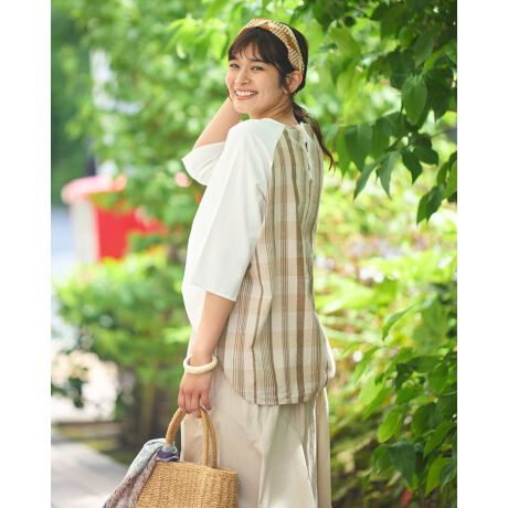 ラフに着られるサイズ感で体型を拾いません。二の腕もしっかりカバーした袖丈です。コーディネートのアクセントになる、後ろ身頃をチェック使いした1枚です。