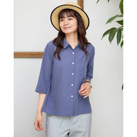 [型番:467R5312]ほのかな透け感が清涼感のあるシアーブラウスです。かっちりし過ぎないレギュラーカラーのボックスシルエットで羽織としても使いやすい1枚です。