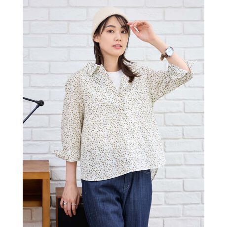 オーガニックコットンのナチュラル感のある素材に小花柄のプリントを施しました。襟付きのプルオーバータイプできちんと感もあり袖口のタック使いが女性らしい印象です。