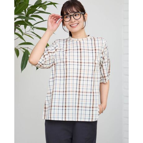 スタンドカラーの襟にタックフリルをあしらったブラウスです。大人配色のチェック柄が色々なアイテムに合わせやすいです。表面が滑らかな素材を使用しているので快適な着用感が魅力です。