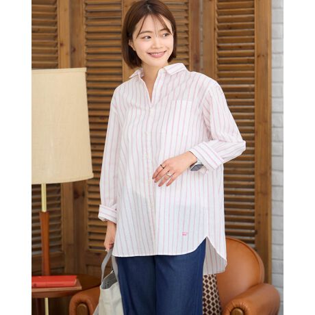 接触冷感機能付きで汗ばむ季節にぴったりなストライプシャツです。羽織に1枚着にとデイリーユースしやすいです。メンズと同素材で展開しています。