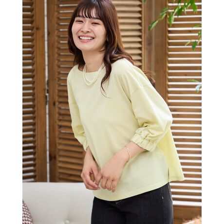 薄手のストライプジャカード素材を使用したトップスです。袖口にゴムを入れて止まるようにしたので袖のニュアスを出しやすいデザインになっています。裾のサイドにスリットを入れたのでボトムインのアレンジもしやすいです。