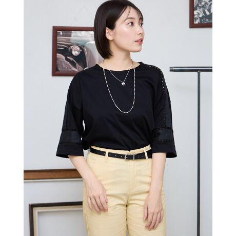 オーガニックコットン100%のシルケットスムースを使用した7分袖のデザイントップスです。袖にはしごレースや異素材を切り替えて、上品な雰囲気のアイテムです。