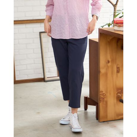 麻混の綿ナイロン素材を使用したクロップドパンツです。生地の表面は凹凸感の有る地柄ストライプになっています。シルエットはヒップ周りにゆとりの有るテーパードです。ウエストベルト部分は切り替えずに、スッキリ見える身頃続きの仕様です。後ろウエストの中心部分にギャザーゴムを入れています。