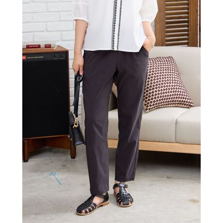 横方向にとても良く伸びるレーヨン・ナイロン・麻の素材です。デザインは股下68cmでヒップ周りにゆとりをもたせたテーパードシルエットのアンクルパンツです。ウエストはギャザーゴム仕様にし開き無しのデザインです。色は黒とカーキの2色展開です。