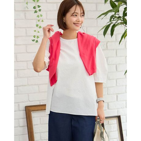 ぽこぽこした格子柄のサッカー素材を使用したブラウスです。ランタンスリーブが今年らしい1枚です。デニムに合わせてカジュアルダウンしたスタイルがおすすめです。