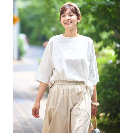 ラフに着られるサイズ感で体型を拾いません。二の腕もしっかりカバーした袖丈です。コーディネートのアクセントになる、後ろ身頃をチェック使いした1枚です。