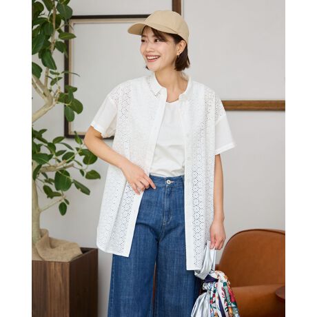 オーガニックコットンを使用したシャツです。前身頃と後ろヨークはレース。襟・前立て・袖・後ろ身は無地になります。ドロップショルダーで半袖丈です。