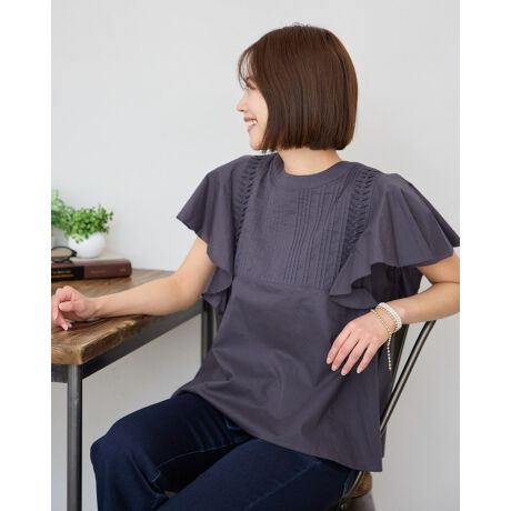粗めの平織りで糸密度が低く透け感のあるボイル素材を使用。適度な張りコシで砕け過ぎず清潔感を保ってお召しいただける素材です。袖のフレアとフロントのピンタックが華やかな1着。甘さや幼さを抑えるためフロントのテクニックはバスト下まで長めに施しダークカラーの展開にしています。ボトムスはデニムやカーゴなどタフなパンツが大人世代にはおすすめ。手首にバングルを添えて辛口にしても素敵です。