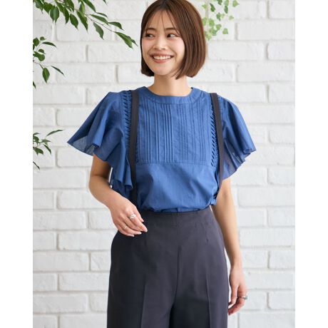 粗めの平織りで糸密度が低く透け感のあるボイル素材を使用。適度な張りコシで砕け過ぎず清潔感を保ってお召しいただける素材です。袖のフレアとフロントのピンタックが華やかな1着。甘さや幼さを抑えるためフロントのテクニックはバスト下まで長めに施しダークカラーの展開にしています。ボトムスはデニムやカーゴなどタフなパンツが大人世代にはおすすめ。手首にバングルを添えて辛口にしても素敵です。