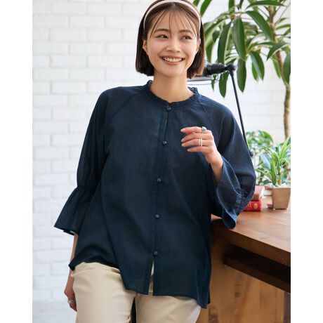ちりめんのような細かいシボが広がるポリエステル素材を使ったブラウスです。生地の表裏がほのかにゆらぎ、肌との接点が少ないためサラッと涼しくお召しいただけます。フレアの入ったボディと袖口が風になびく様子もフェミニンで全体的にシアー感があるためインナーの着用がおすすめ。シャーリングを寄せた襟がポイントになり1枚着を楽しむ他、冷房や日除け対策の羽織りとしても便利です。