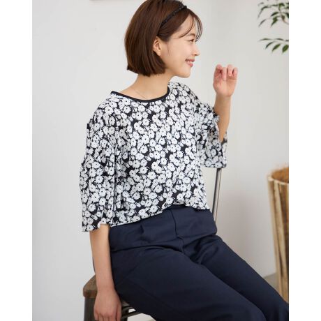 しなやかに落ちる平織りの綿レーヨン素材を使用。整った織り目から生まれる清潔感が魅力です。ボクシー型のシルエットと短めの着丈でボトムスを選ばない1着。ほどよいゆとりで風が通り抜ける様子も素敵なブラウスです。生地いっぱいに広がるのはマリーゴルドの花。鮮やかで力強く花壇に華やかさをもたらす様子から気品という花言葉が付けられました。より清楚に映るように色数を抑えて表現しています。