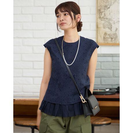 生地全体に刺しゅうや穴の開いたアイレットの連続模様が施されているオーバーレースを使った華やかなブラウス。裏面に別地を付け肌が透けることなく着用が可能。タイトなネックとは反対に腕を出し肌の露出に強弱を付け品の良さや大人っぽさを演出しています。肩先を少し覆った袖口のディティールもポイント。バングルを添えた辛口なコーデやデニムを合わせて甘さを軽減した着こなしもレースが活きて素敵です。