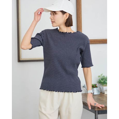 タテヨコ方向のテンションに優れたリブを使ったプルオーバー。ほどよい厚みと弾力があり身体に張り付きにくい素材を使用。細いラインをポイントにして編んだボーダーと襟や袖口に施したメロウの始末がフェミニンで下着感の薄れた、使い勝手の良いアイテムです。ジャケットやキャミワンピのインナー使いのほか、ボトムスを選ばないためオン・オフの両軸でお召しいただけます。