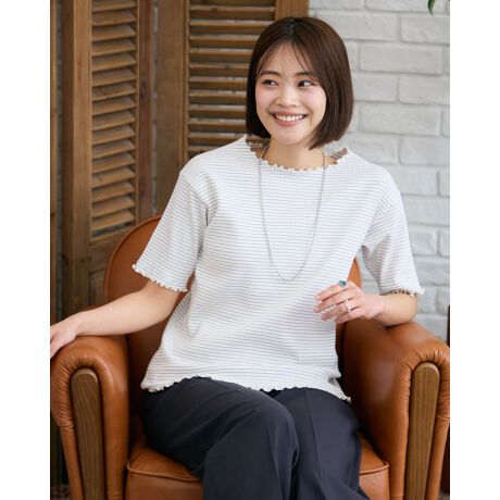 タテヨコ方向のテンションに優れたリブを使ったプルオーバー。ほどよい厚みと弾力があり身体に張り付きにくい素材を使用。細いラインをポイントにして編んだボーダーと襟や袖口に施したメロウの始末がフェミニンで下着感の薄れた、使い勝手の良いアイテムです。ジャケットやキャミワンピのインナー使いのほか、ボトムスを選ばないためオン・オフの両軸でお召しいただけます。
