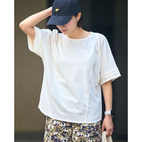 ほのかな光沢と整った編み地でキレイ見えする天竺を使用。綿ポリエステルでホームケアしやすく汗ばむ季節にも清潔を保ってお召しいただけます。アームホールに切り替えのないドルマンスリーブの設定で身体が服の中で泳ぐゆとり感に、こなれた雰囲気があり大人世代におすすめ。ボトムスを選ばず前の裾を少しタックインしてアクセントを付ける着方が可愛いです。シンプルなフロントにネックレスを添えてもGOOD。