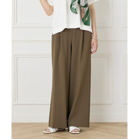 ■デザインウエストゴムのイージー仕様の1タックワイドパンツ。ウエストのフロント部分はベルトになっているので、トップスをインにした際の見た目が綺麗に見えます。裾を広げ過ぎず、腰から真っ直ぐ落ちるシルエットはIラインシルエットで縦が強調されるので、スッキリと見えます。トップスを問わずに幅広いアイテムに合わせやすく、さらにシーズンレスで履けるおすすめのパンツです。■素材ふくらみ感とストレッチ性に優れたきれいな中肉合繊です。生地の追い込みが効いており非常にキックバック性があります。・裏地あり・ウエスト後ろゴム仕様・ポケットあり・水洗い可