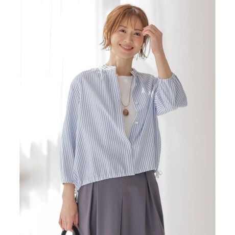 ■デザインブルゾンのようなアウター感覚にも羽織れるバンドカラーのシャツブラウス。Aラインのゆったりとしたシルエットでサッと羽織れる1枚になっています。ストンと落ちたストレートラインと裾のテープを寄せてブラウジングさせ、サイドが少し落ちたようなスタイルにもできます。8分袖の袖丈はゆるいゴム入りなので、暑い日にまくり上げても留まる便利な仕様に。ショート丈でギャザーやタックによるボリューム感のあるシルエットは、デザイン性とトレンド性のあるシャツブラウスです。