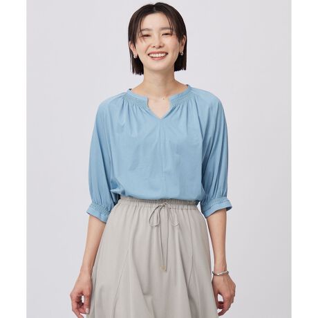 ■デザインシャーリングディテールを入れ、カジュアルな雰囲気に仕上げたプル―オーバー。ラグランスリーブがほどよく肩になじみ、ほどよく体から離れるシルエットに加え、襟元と袖口にひだを寄せて施したスモッキングがポイントです。大人っぽさとリラクシーを両立した1枚になっています。