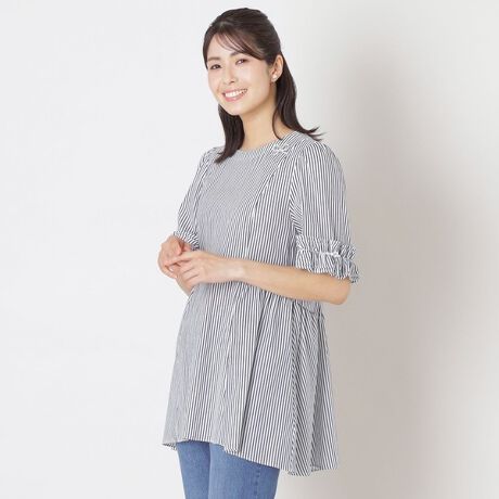 ショルダーからのパネルラインによる縦長効果のあるルエットパターンです。脇から後ろにかけてのパネルラインにウエスト切替を施し、ギャザーを寄せてバックテールの裾デザインに仕上げました。袖口には共布のフリルを二枚重ね、中央にはビジューモチーフをあしらって華やかさをプラスしています。カラミ組織のストライプ柄に、エレガントなディテールを添えたチュニックブラウスです。
